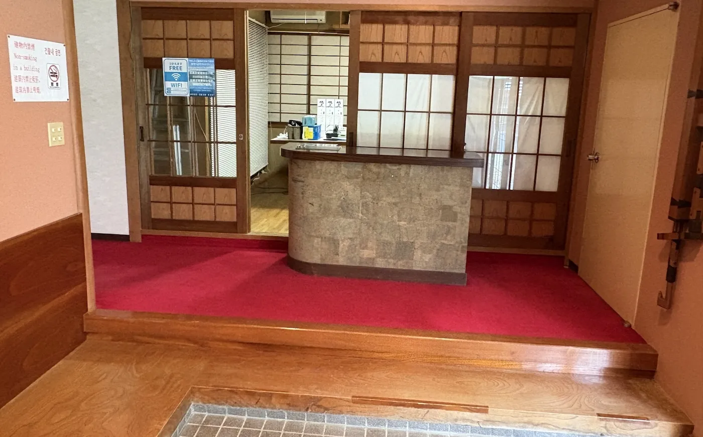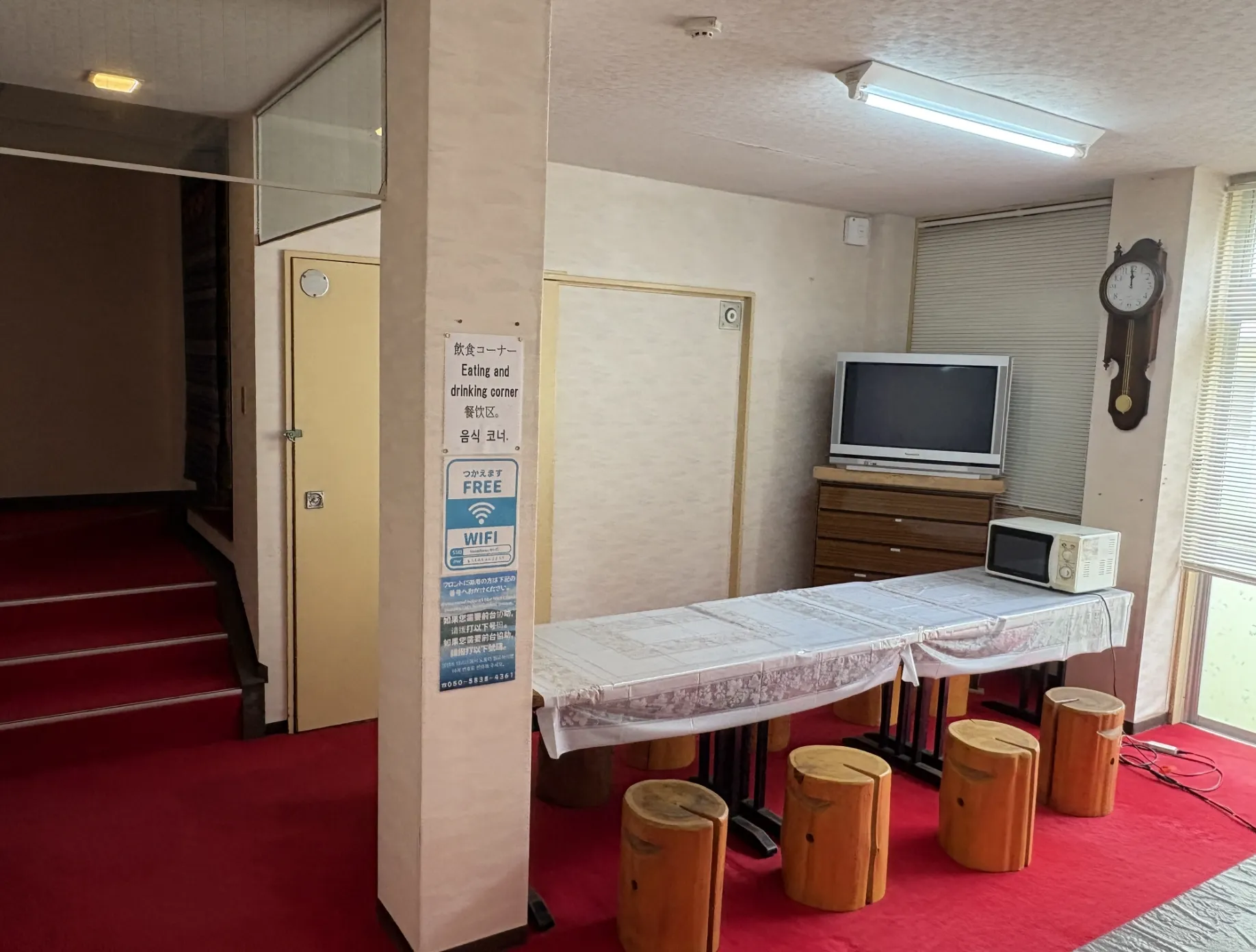 フロント、共有お食事スペース(電子レンジ、電気ポット、冷蔵庫)、喫煙スペース